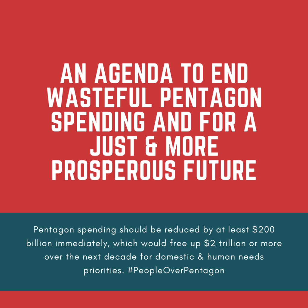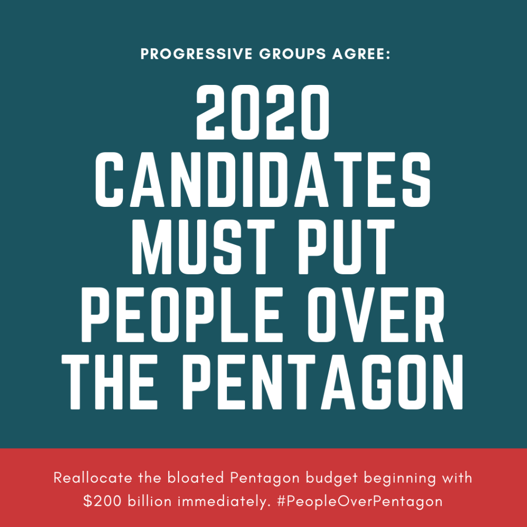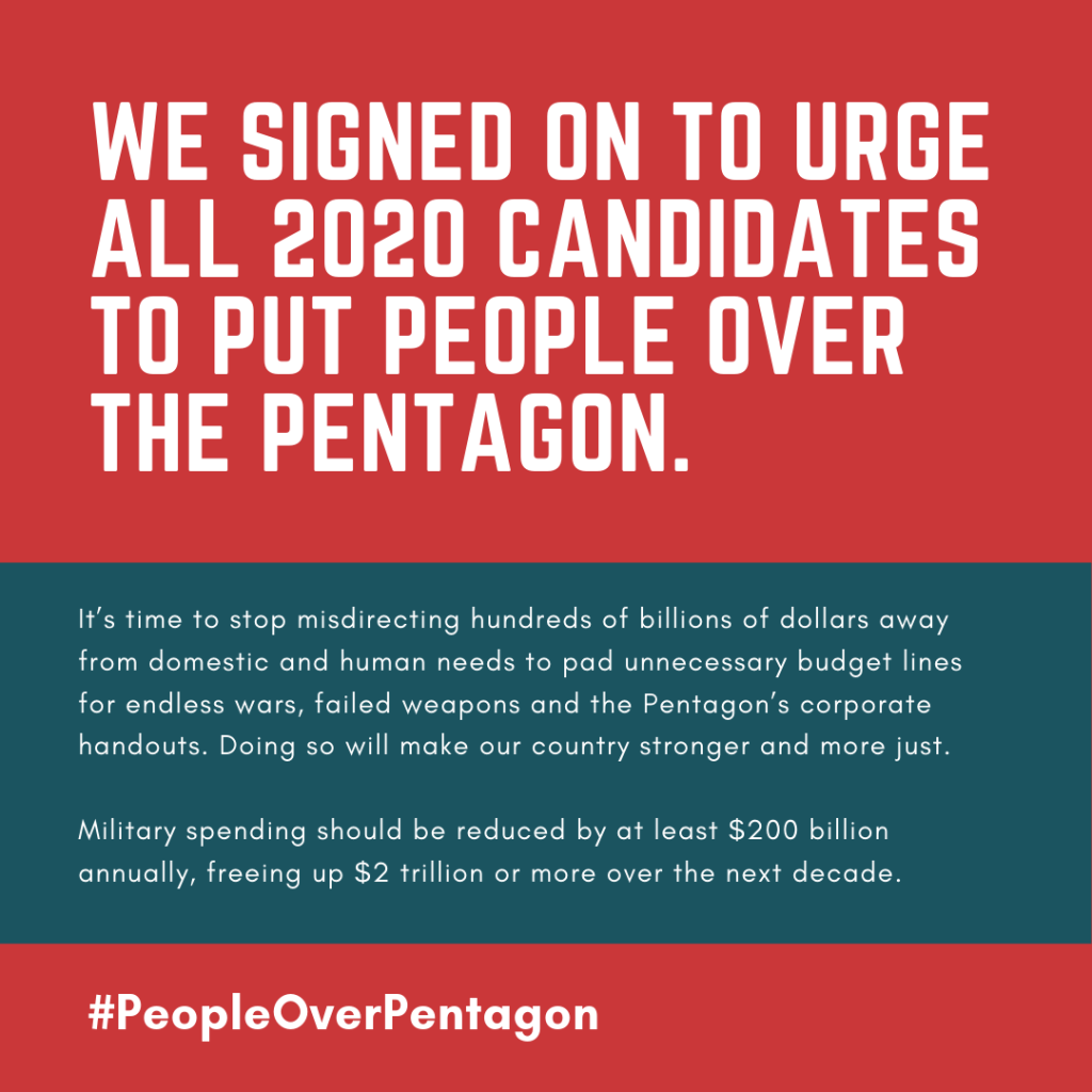 - We urge all 2020 candidates to put #PeopleOverPentagon. We should be investing in people-first programs like [MEDICARE FOR ALL, GREEN NEW DEAL, OTHER], not endless wars, failed weapons and corporate handouts. peopleoverpentagon.org