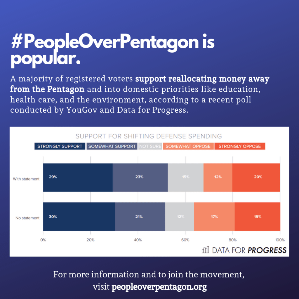 - 52% of respondents in a recent @DataProgress poll are in favor of reallocating military spending towards health care, education, the environment and other pressing human needs. We urge all 2020 candidates to show us their plans to put #PeopleOverPentagon: peopleoverpentagon.org